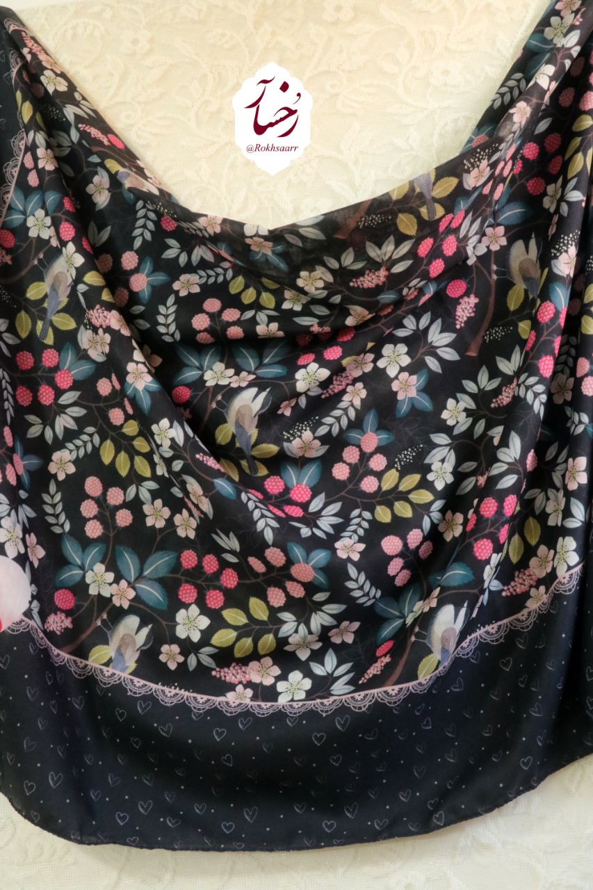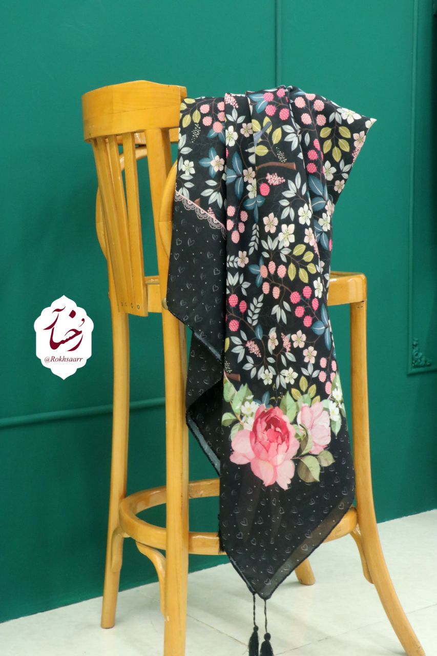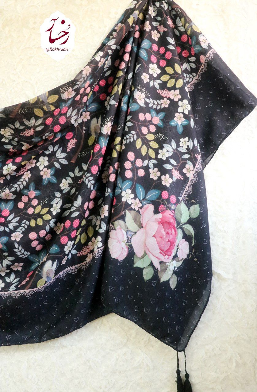 کالکشــــ۴۰۵ـــن بهآر رُخسآر 🪻🌱⚘️ 🌸⚜️ روسری تمشک ⚜️🌸 🔸️جنس : نخی کیفیت خوب و خوش ایستا و لطیف اصلن سُر نیست و خنک . 🔸️قواره : حدود ۱۳۰ الی ۱۴۰ سانت 🔸️ دورچرخدوز منگوله دار 🔸 رنگ زمینه : سورمه ای تیره . ◇