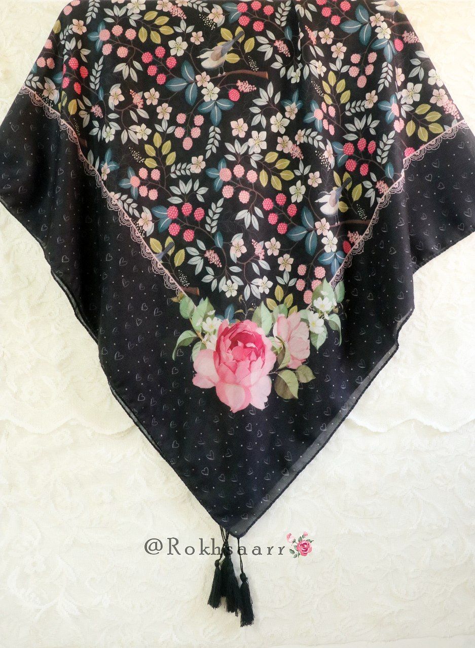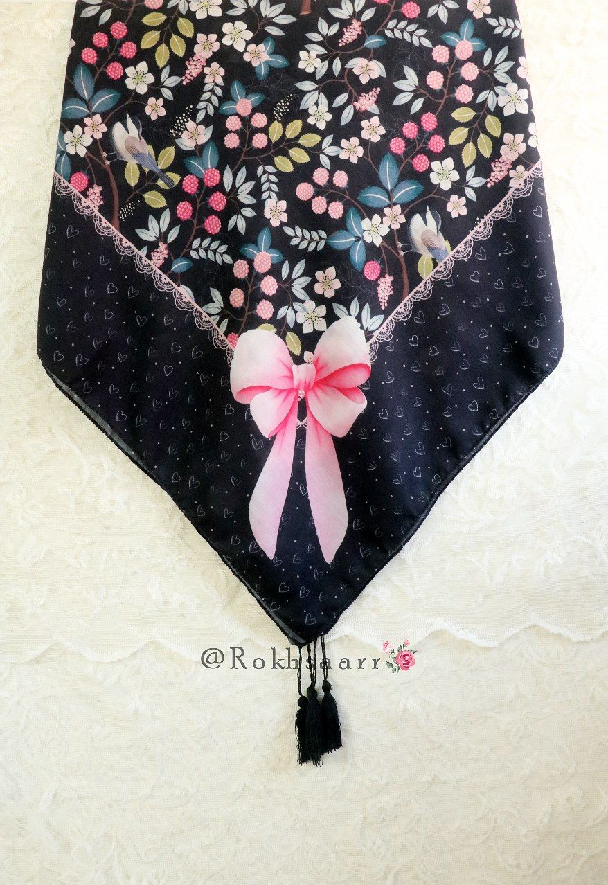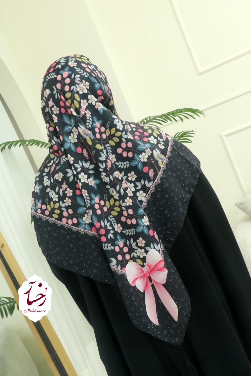 کالکشــــ۴۰۵ـــن بهآر رُخسآر 🪻🌱⚘️ 🌸⚜️ روسری تمشک ⚜️🌸 🔸️جنس : نخی کیفیت خوب و خوش ایستا و لطیف اصلن سُر نیست و خنک . 🔸️قواره : حدود ۱۳۰ الی ۱۴۰ سانت 🔸️ دورچرخدوز منگوله دار 🔸 رنگ زمینه : سورمه ای تیره . ◇