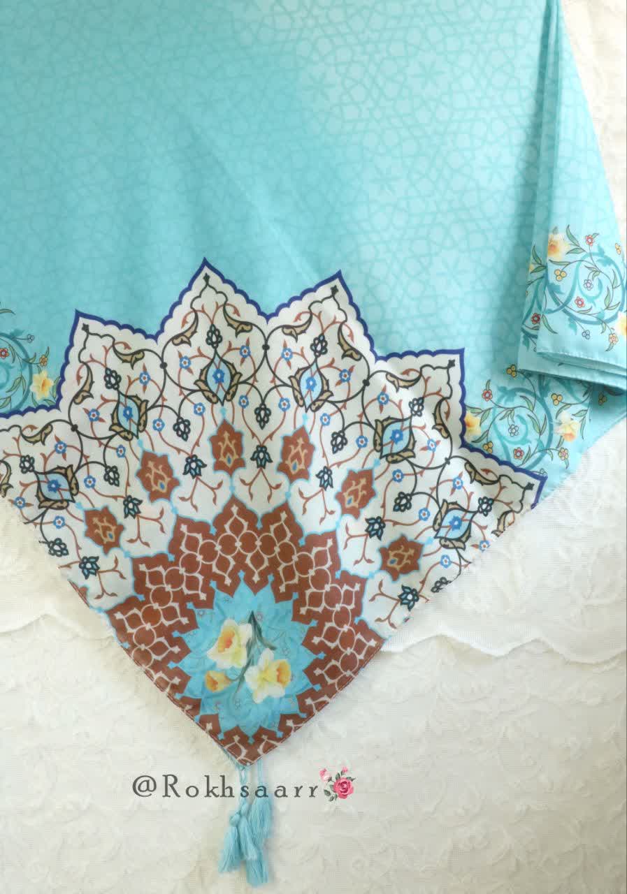 کالکشــــ۴۰۵ـــن بهآر رُخسآر 🪻🌱⚘️ 🩵⚜️ روسری انتظار ⚜️🩵 🔸️جنس : نخی کیفیت خوب و خوش ایستا و لطیف اصلن سُر نیست و خنک . 🔸️قواره : حدود ۱۳۰ الی ۱۴۰ سانت 🔸️ دورچرخدوز منگوله دار 🔸 رنگ زمینه : آبی روشن ◇