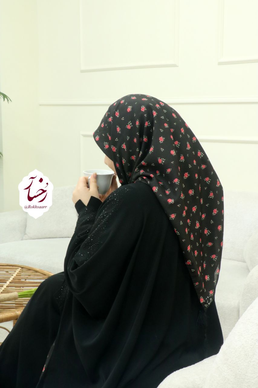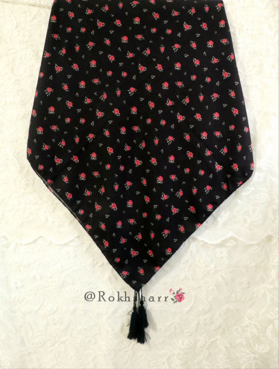 کالکشــــ۴۰۵ـــن بهآر رُخسآر 🪻🌱⚘️ 🌹⚜️ روسری گلـــــــدُخت ⚜️🌹 🔸️جنس : نخی کیفیت خوب و خوش ایستا و لطیف اصلن سُر نیست و خنک . 🔸️قواره : حدود ۱۳۰ الی ۱۴۰ سانت 🔸️ دورچرخدوز منگوله دار 🔸 رنگ زمینه : ذغالی تیره و گل های قرمز . ◇
