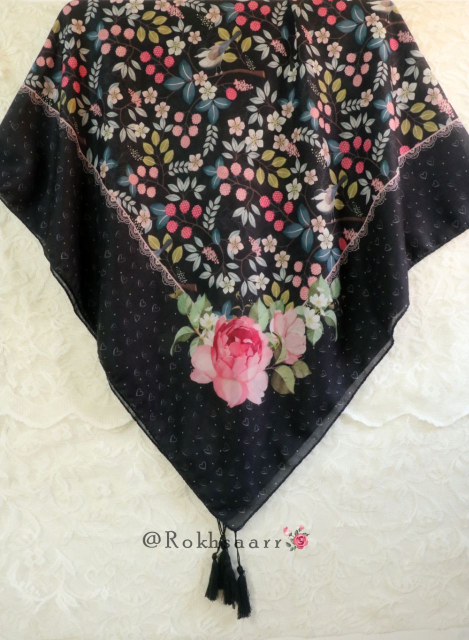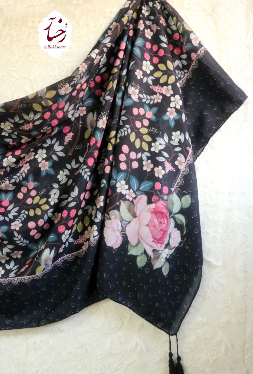 زمینه رنگ سورمه ای تیره 🔸️جنس : نخی کیفیت خوب و خوش ایستا و لطیف اصلن سُر نیست 🔸️قواره : حدود ۹۰ الی ۱۰۰ سانت 🔸️ دورچرخدوز